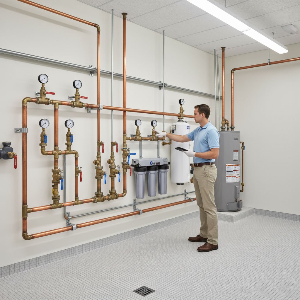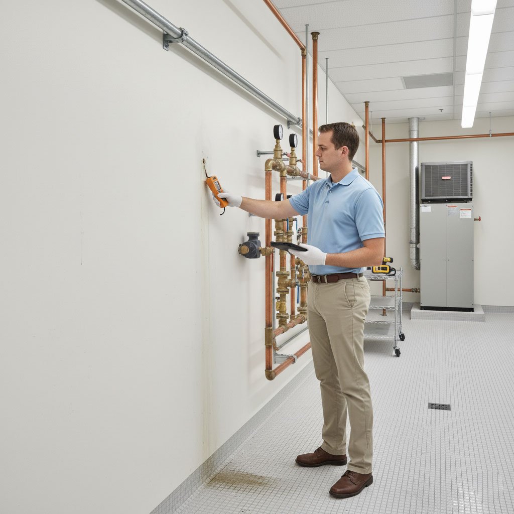 Sistemas de Plomería Pruebas de presión de agua, flujo y detección de fugas. Revisión de tuberías, bombas y tanques. Verificación de sistemas de drenaje y suministro de agua sanitaria.